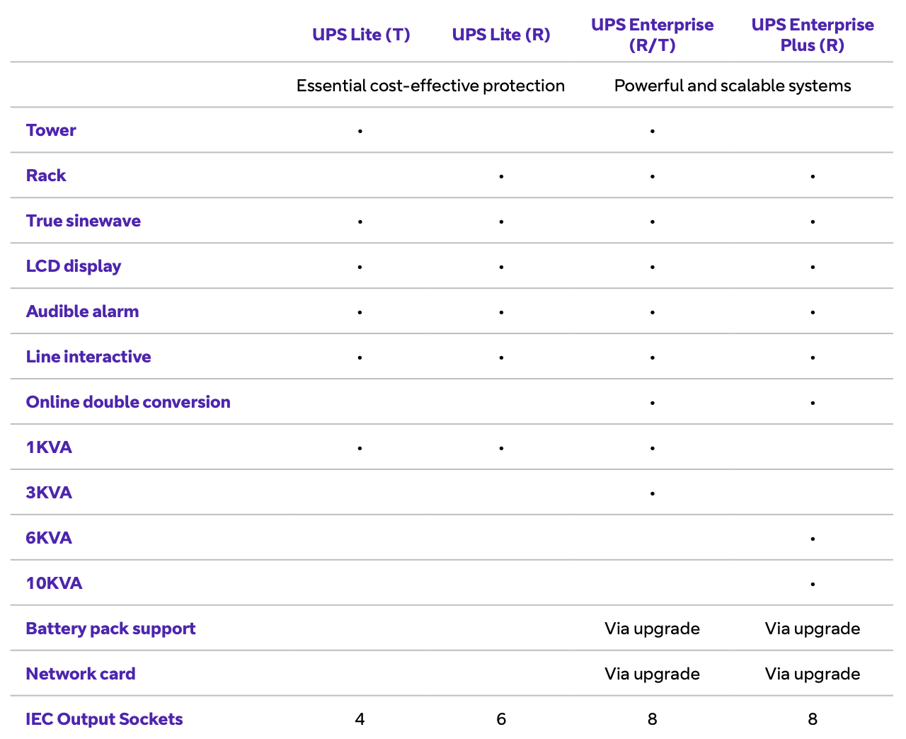 Pick from our two ranges. Choose UPS Lite for a simple and costeffective option. Get UPS Enterprise if you need the ultimate back-up power. Add expandable battery packs to keep going for even longer if your power goes down.